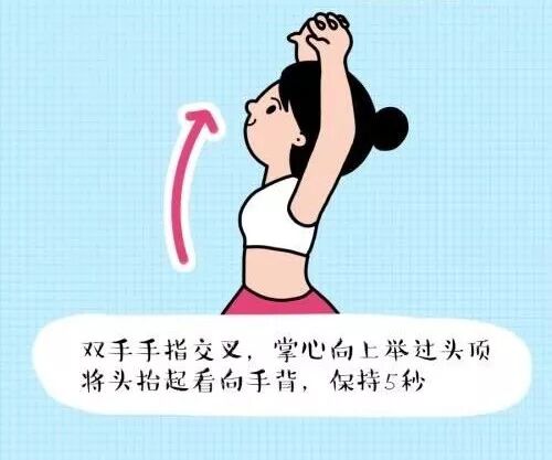 双手交叉,掌心向上,举过头顶;抬头看向手掌保持5秒,做30次。