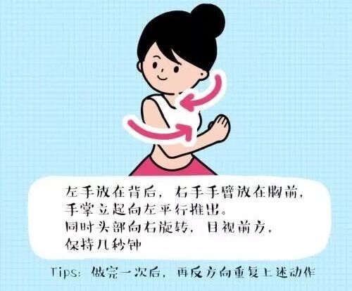 左手放在背后,右手手臂放在胸前,手掌立起向左平行推出;头部同时向右看,保持3秒钟;换手换方向。