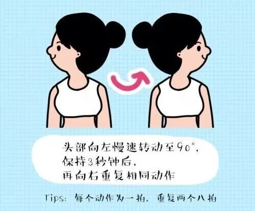 头向左转90度,停留3秒,回归正位,再向右转90度,停留3秒,一边30下,共60下。
