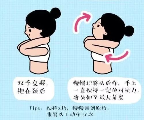 双手交叉,置于头颈后侧,头颈慢慢用力向后和手相抵抗。