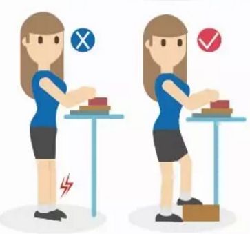 小贴士: 工作时脚下踩踮脚物 并双脚轮替 可以增加腰椎前凸 同时缓解腰背部肌肉紧张。如果长期站立可做 些腰部伸展 动作。