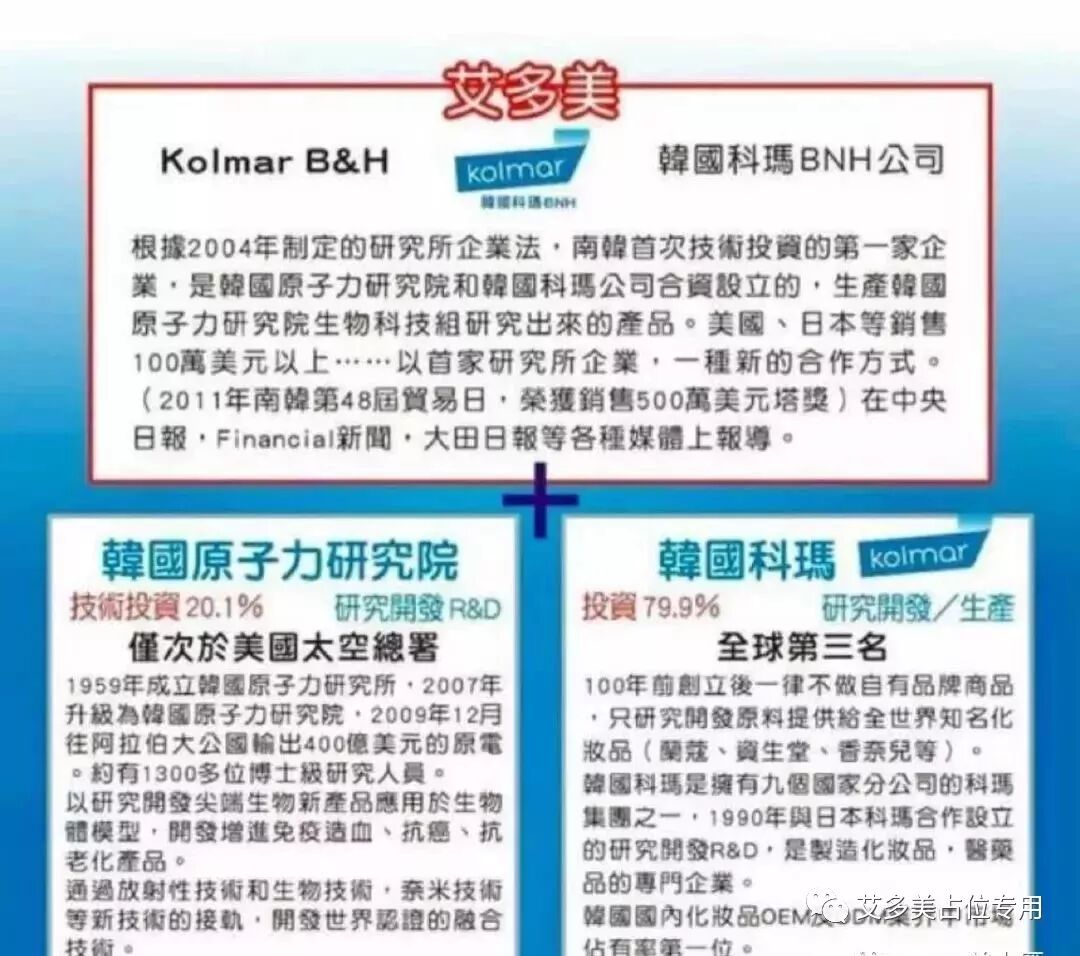 Atomy艾多美公司是专卖由韩国原子力研究院和韩国科玛公司合资设立的SUNBIOTECH(sbt)研制生产的产品。产品是纯天然植物以纳米技术提取的完美结合。
