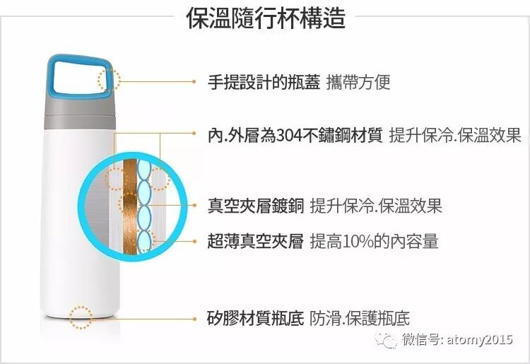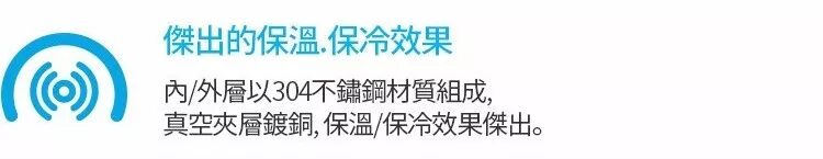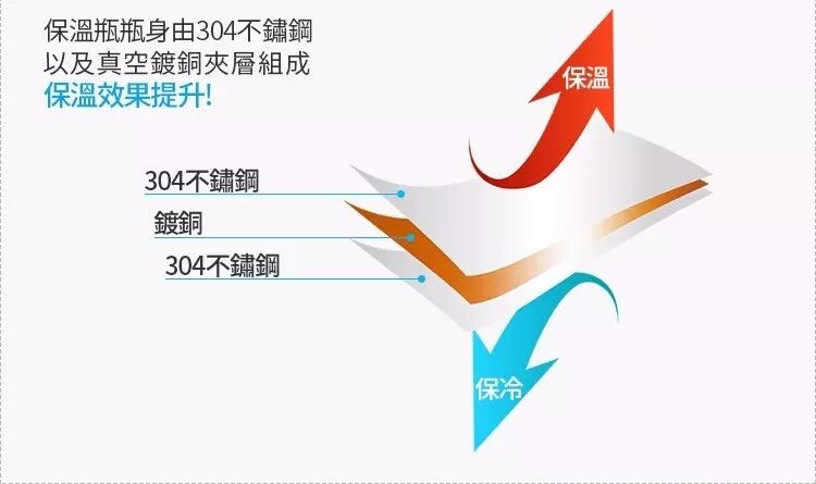 保温杯的最大特点是可以将冷的东西保持在冷的状态(保冷),将热的东西保持在热的状态(保温)。其原理是不锈钢内胆的外层和内层之间为真空,利用真空层降低为热传导效率防止热量散失。若在寒冷冬季,用普通杯子盛水很快热量散失殆尽,自然降低了人对水的渴求。一款设计合理、品质卓越的保温杯能将六小时内温度变化的范围控制在15℃左右,满足人体对水和温度的需求。若在炎炎夏季,人们开始偏爱冰爽口感,可在保温杯中加入冰块,随时随地地尽享冰爽。