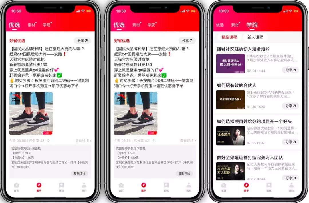 现在,我们的好省已经可以为大家事业的发展提供系统、全面的服务与支持。我们专业的伙伴每天都会为大家筛选出淘宝天猫上物超所值的宝贝,归类在【聚划算特卖】、【销量榜单】、【今日必抢】、【9.9包邮】等类目中,从而节约大家挑选推广的时间,在选品方面给到大家最有力的支持。此外,好省强大的文案美工团队每天都会高频次地更新推广素材,同时,我们的技术大咖也会实时在线,保证APP的正常有序运行。
