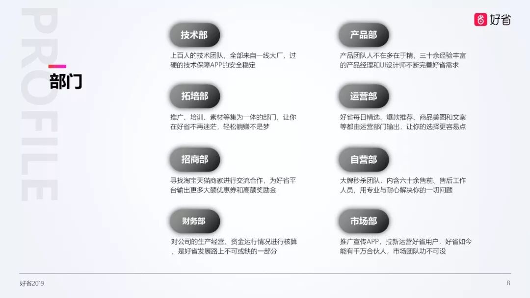 团长模式一经提出,就爆发出惊人的能量,截至4月,平台用户数量已经达到了50万人。此后公司频频出手,借助0元夺宝、云发单功能、大牌秒杀等活动,截至9月顺利突破日注册数量10万人大关。好省前期的所有积淀在双十一爆发出了巨大的能量,当日总成交额突破10亿。目前,好省合伙人数量突破1600万人,日活用户突破500万人。为了给大家提供全方位的服务,公司规模也不断扩大,囊括了八大职能部门,员工人数达到300余人,且核心岗位由分别来自阿里巴巴、腾讯、网易、蘑菇街等一线互联网公司的技术大牛和产品大神担任。