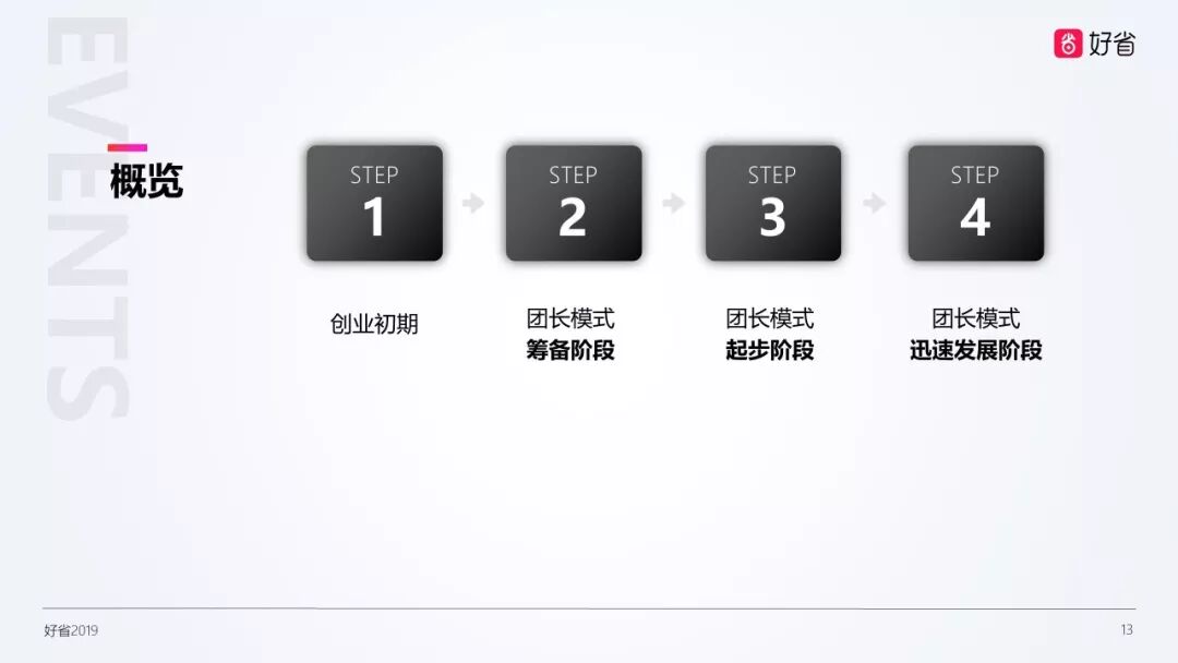 接下来,我们可以一起了解一下好省的发展历程。我们好省创始团队从2015年1月开始涉足电商导购领域,同年7月便获得A轮融资2400万元。此后,公司经历了创业初期、团长模式筹备阶段、起步阶段和迅速发展阶段。2017年6月,我们好省项目正式启动,经过一个月的内测,我们的APP正式上线,而且当天下载注册的用户就已经破万。经过半年的推广,平台日活用户突破10万,为了适应新的发展趋势,2018伊始,好省团长概念正式提出。