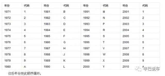 车辆识别码(Vehicle Identification Number,或车架号码),简称VIN,是汽车的身份证号,它根据国家车辆管理标准确定,包含了车辆的生产厂家、年代、车型、车身型式及代码、发动机代码及组装地点等信息,由此我们可以准确的判断车的生产年份,大家只要看第十位就可以了