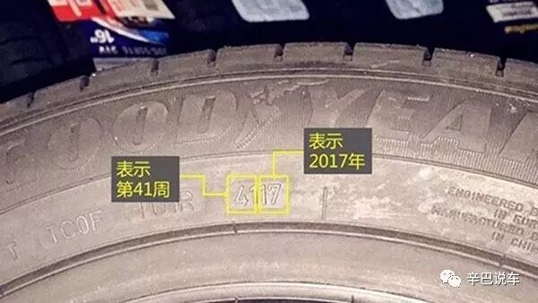 例如上面这个轮胎上的标志后四位数字是4117,17代表年份2017年,41代表第41周,即第11个月,也就是2017年11月初生产的。