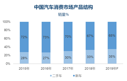 据行圆汽车产业研究团队评估,2019年国内整体购车需求为4300万辆,其中二手车销量将突破1500万辆,市场份额达到35%。