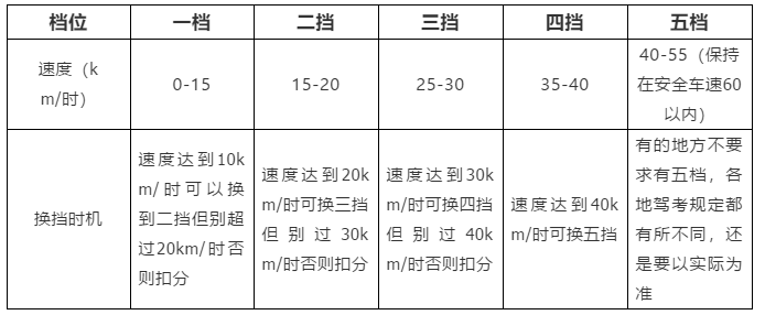 考试的时候我们需要注意:长时间的使用低速挡属于拖档,一档拖行超过50米是会被扣分的。一档只用于起步或者掉头靠边停车等项目,切忌不可以长时间的低速行驶。当我们起步的时候,等离合完全松开,给点油门就可以换到二档了。