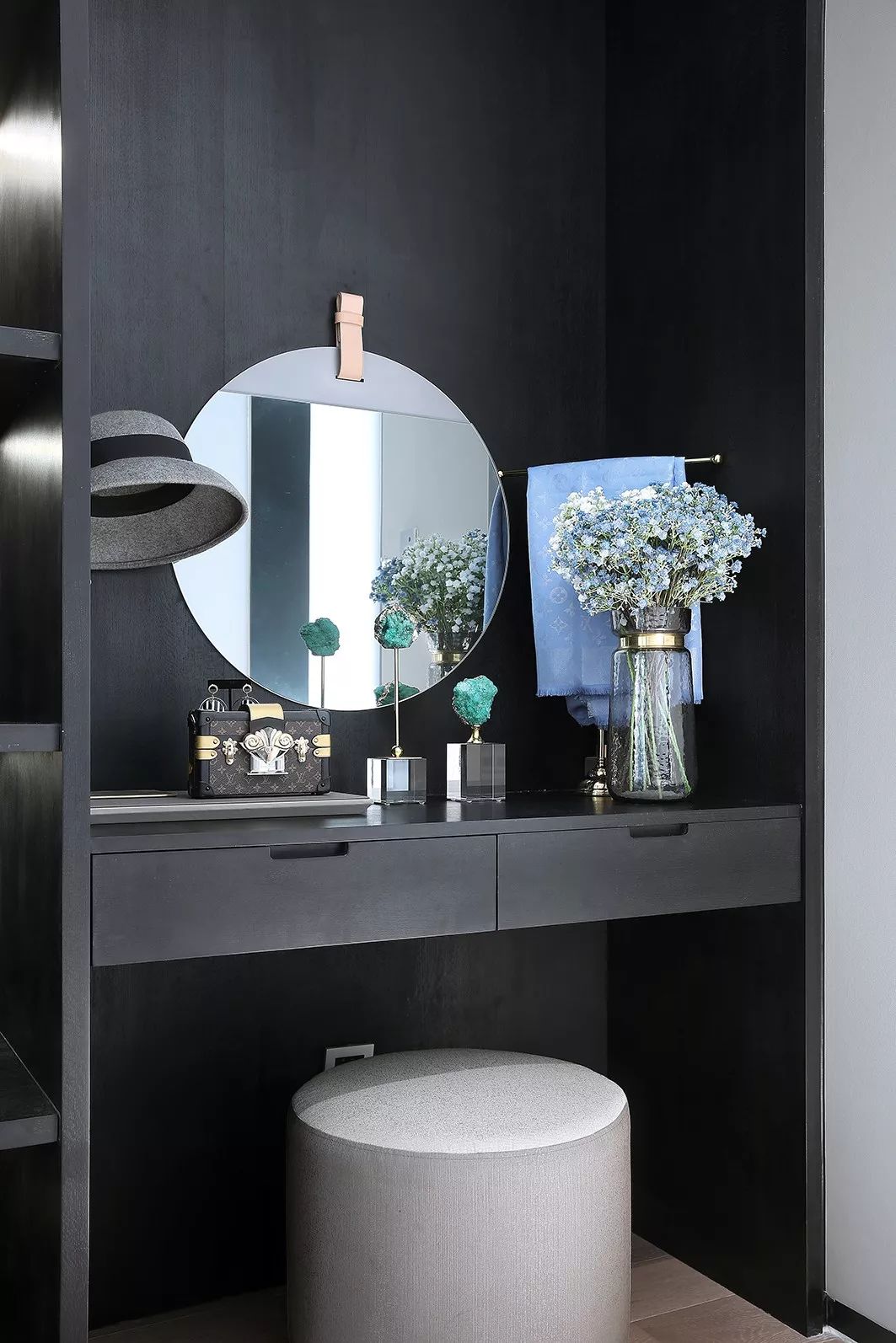 主卧主背景以白灰黑构成,极简中透着贵气,不同性格的材质产生不同的感情力量,蓝色串联起的点缀又让空间添了一份静谧清雅。