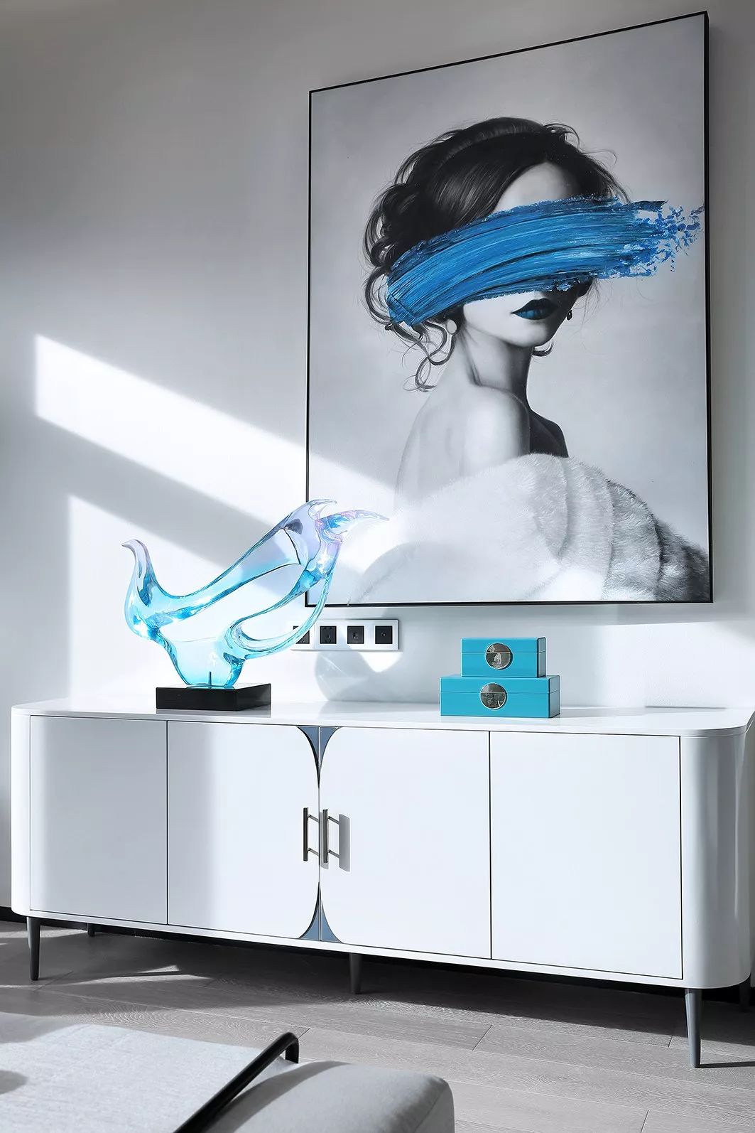 墙面以白黑为主基色,一抹清蓝点亮整个空间,意将人的视觉感受归纯。金属质感与琉璃光影在白色石材的映衬下显得灵动而清丽。