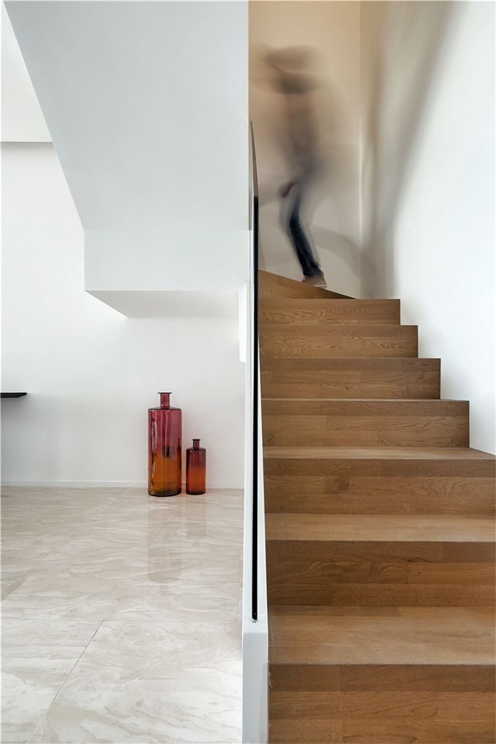 ▲小型的复式空间,楼梯往往被看待成一种急需解决的病症,“大刀阔斧”之后往往陷入新的尴尬境地。平衡上下层的功能流线关系,原有楼梯设定即是合理,巧妙的处理扶手与踏步的关系成了关键细部。