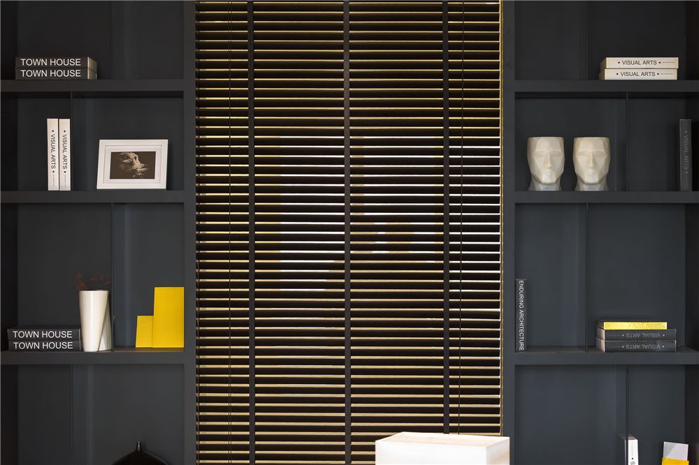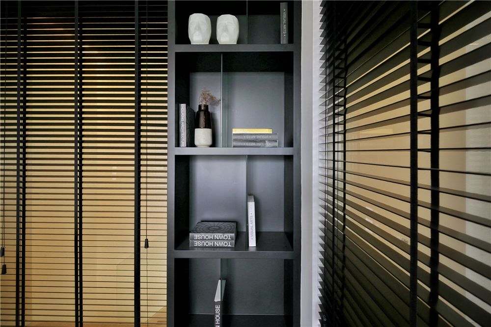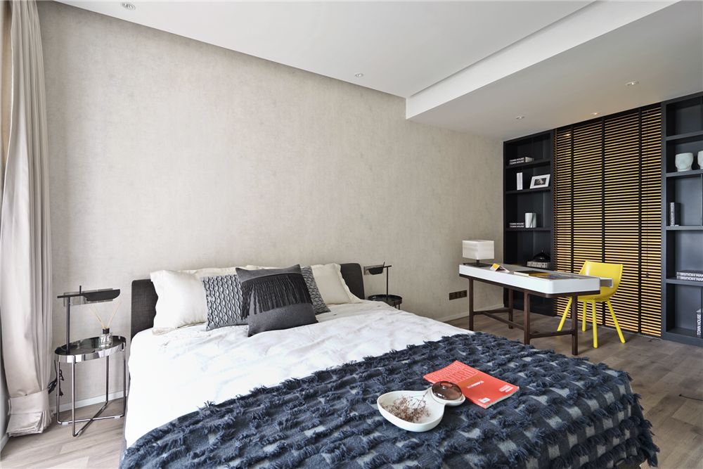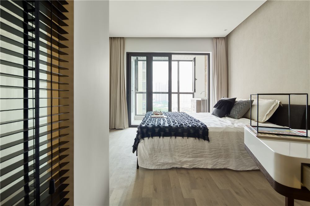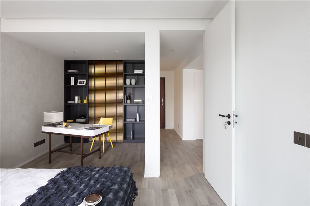 ▲主卧室以白系面貌呈现,套入书房更有家的态度,手刷纹木地板以质感带出空间的温暖。大面积的白色铺陈,让卧室的本色高级稳定,而开敞式书柜的结合到玻璃,更有大块面的黑色出现在房间的底端,空间的气氛随之缓慢而定静,透过木质百叶落地窗帘的光影折射,一种平衡的张力令人舒坦放松。
