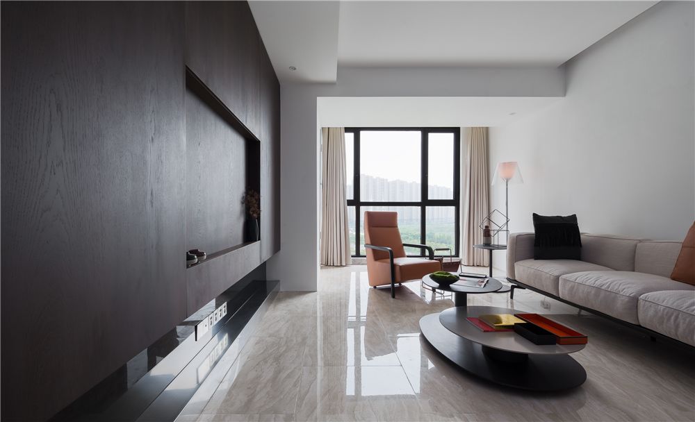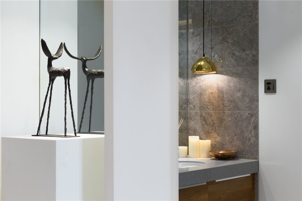 ▲想要过怎样的生活,建筑室内的构建方式依随着生活的态度发展。对于单面采光的建筑内部,需要最大可能的吸收光线,让日光折射出不同的光谱。公区整体的开放态度,一气喝成的流线设计,让空间的运用可为随心所欲,原有形体笨拙的墙面用功能弱化,入户即有整面的储物系统,空间立面依托秩序感丰富的块面关系做协调,线面比例切割之间偶有镜面的出现,再配合上中性优雅的雕塑,空间得以延续并塑造出趣味的生活态度。