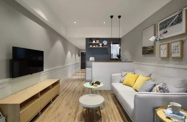这就是26.5平米小公寓的客厅,整体北欧风的风格,原木色的地板,加上黑白灰的家具和饰品,让空间显得宽大又温馨。