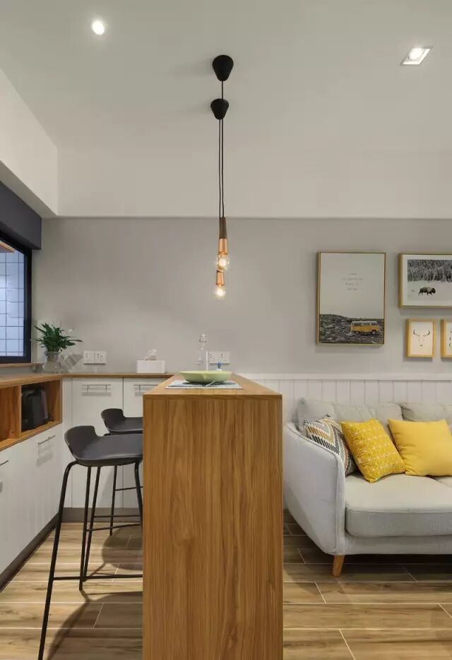 被设计师分隔出来的开放式餐厅。因为房型限制没有办法放置常规的餐桌,设计师用吧台做了半隔断处理,兼顾了休闲和用餐两个功能。