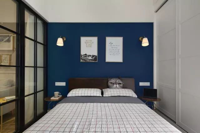 卧室空间,深蓝色的墙面让整个空间显得静谧深邃,金色框的挂画和蓝色搭配很显质感。