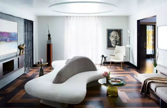 现在好像比较少见,不过早在1950年就有弧形沙发的设计了,弯曲的形状会让空间更加灵动,布置在大空间的客厅中非常舒服有个性;