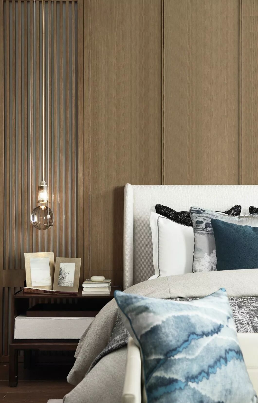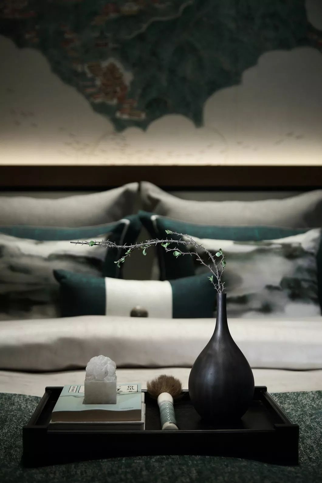 充满空间诗学的卧室,安静的色彩搭配,墙面的山水意境画传达出空灵之美,至此远离都市的喧嚣。