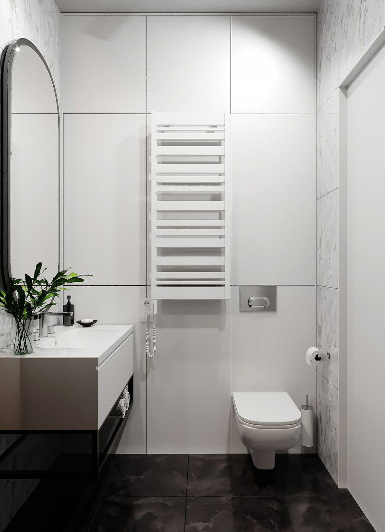 在布局紧凑的浴室中,平衡储存需求和呼吸自由的空间感是比较棘手的问题。悬空的洗手盆设计是一个很好的方案。它给你很多的空间来存储必需品,但是底部的空旷就像是空气流动的出入口,不让人感到压迫、紧张。