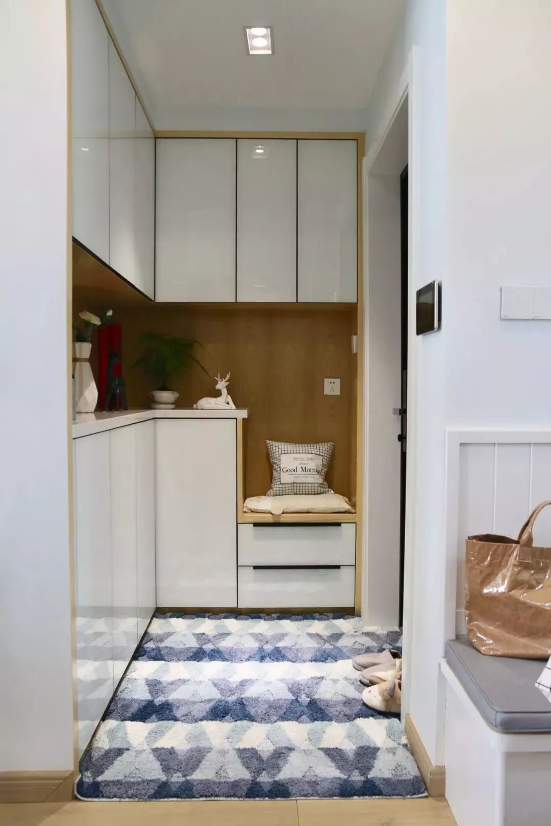 相比纯白色或木色的鞋柜,这样搭配的设计是不是感觉好看多了?