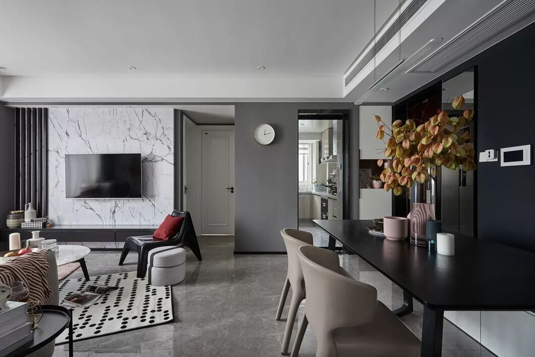 餐厅与客厅之间没有鲜明的界限,而是将两者处于一个开放式的状态。一则为了节省小户型的面积,二则便于加强家庭成员间的交流,尤其是日常的亲子陪伴与互动。