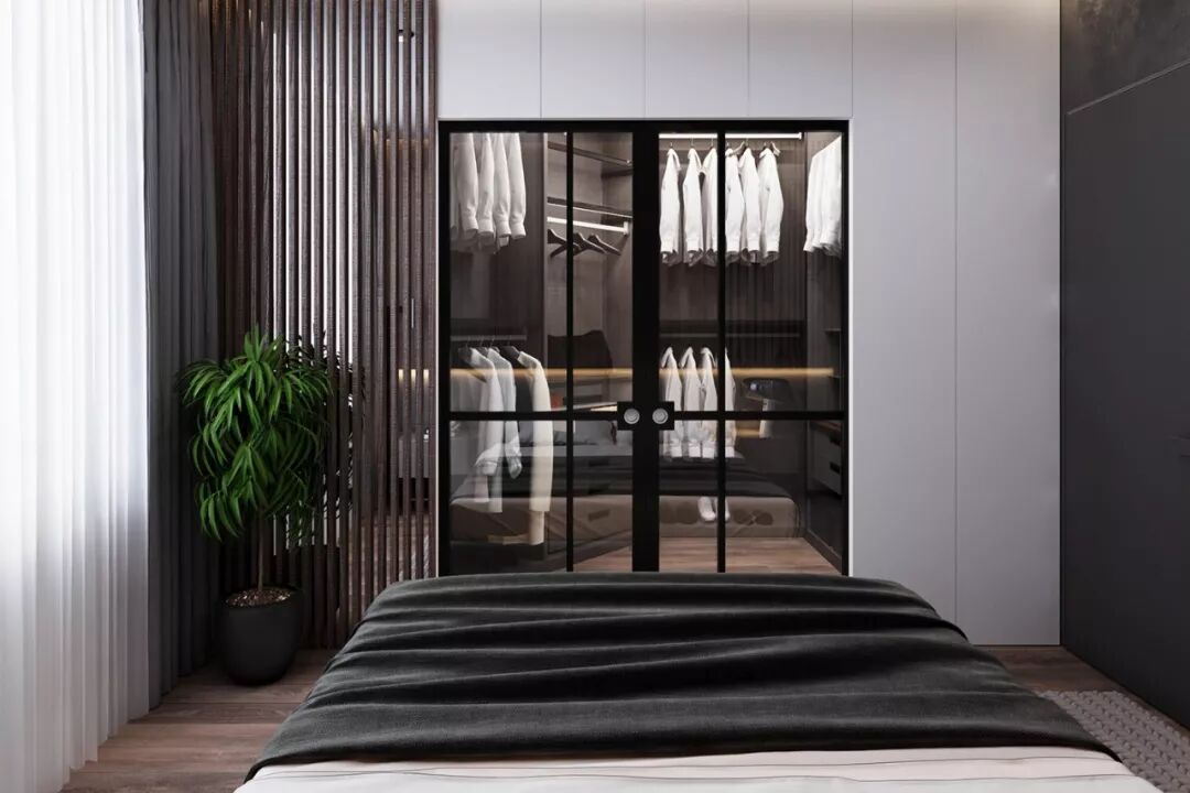 卧室可以充分利用房间的拐角处打造衣帽间,如把卧室床头前移1.2米,在后面设计一个小型衣帽间。卧室的床对面也可以设计成开放式衣帽间,搭配简洁的玻璃推拉门设计,非常方便实用。
