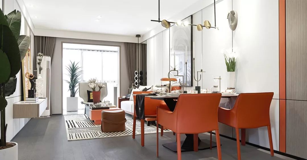 空间呈现活泼温柔的气质,橙色点缀其中,展现张扬与个性,勾勒出温暖的生活氛围。在阳光的调和下呈现微妙细腻的变化,流露出家的温馨与浪漫。