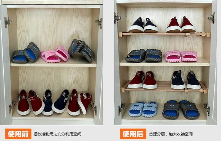 或者最简便的办法就是:设置两个可活动的层板,或者自己单独购买伸缩杆,一层变两层超级实用,具体高度可以根据鞋帮来调整。
