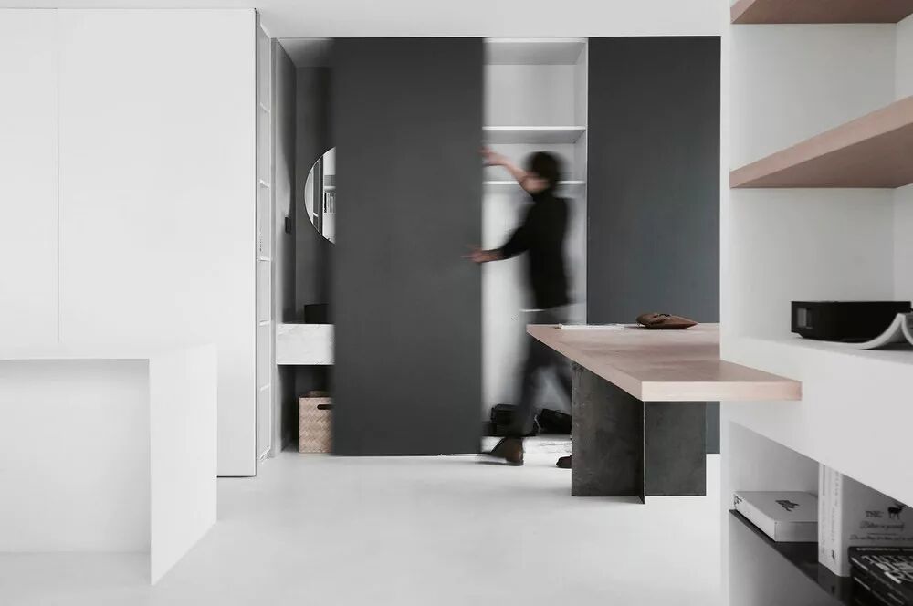 书桌处的移动门解决了储物和洗手的功能