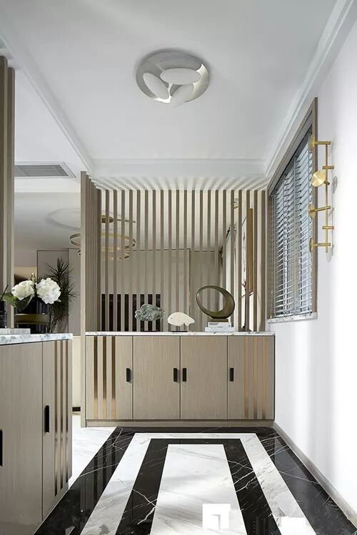 嵌入式鞋柜一般是和进门吊顶结合设计的,不仅美观实用而且可以大大节省室内空间。利用墙面的空间,在考虑墙体的承重范围下,在玄关处设计嵌入式鞋柜,能够保证鞋柜足够安全。