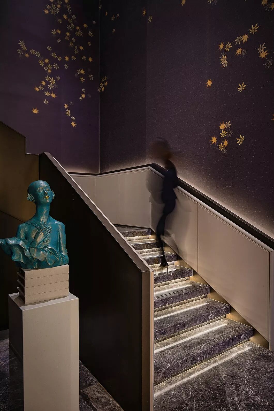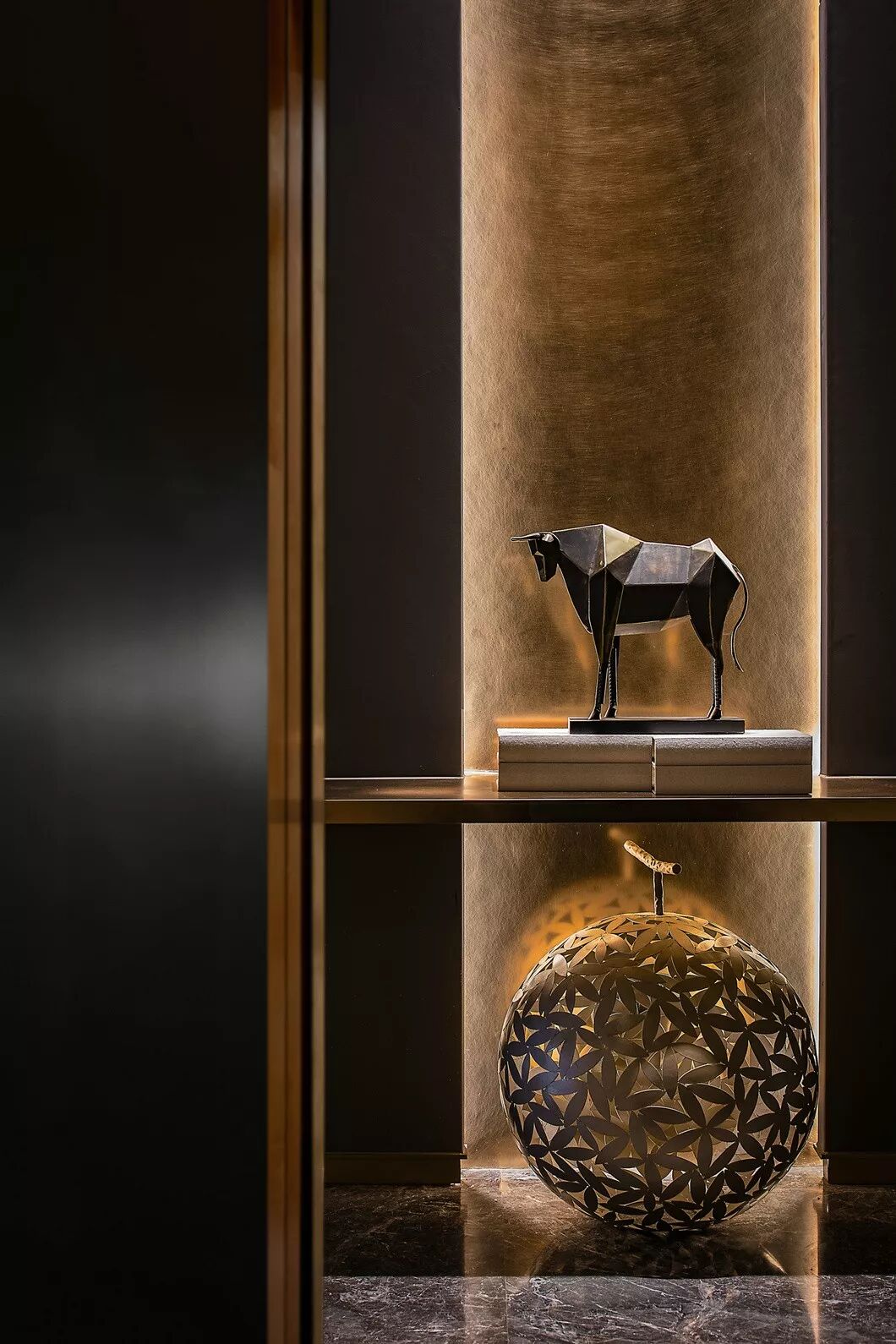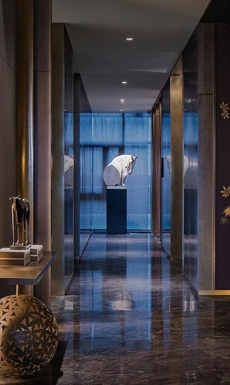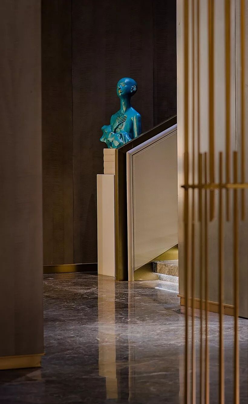 接待区,一件造型柔美的羽毛装饰雕塑作为本案开篇,轻盈灵动的羽毛与厚重沉稳的金属、石材形成鲜明对比,一刚一柔,藏秀于中,赋予空间生命与趣味性。
