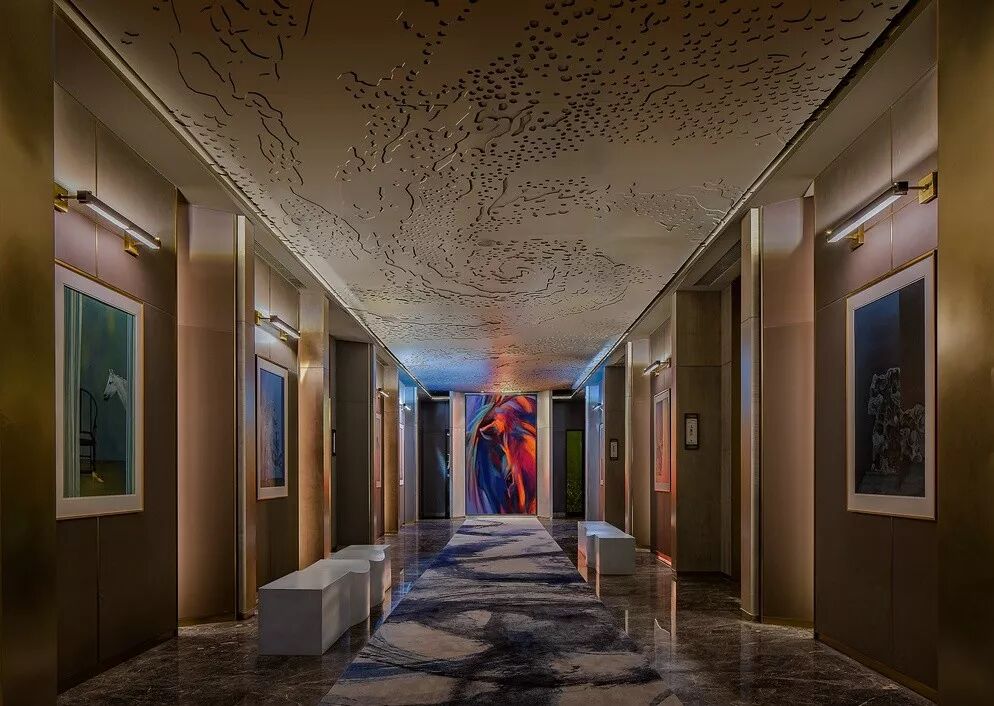 通道被设计师改造成功能与艺术兼具的游廊,如同书法的气,挥手行墨,以大写意的手法,勾勒出艺术长廊的空间格调。