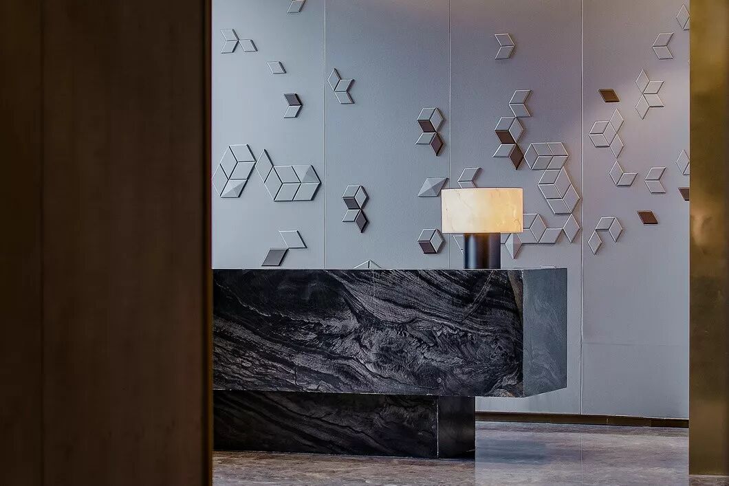接待台以多重材质之间相互碰撞、映射,在空间中达到微妙的平衡,以和谐的组合方式完成了交替与融合。