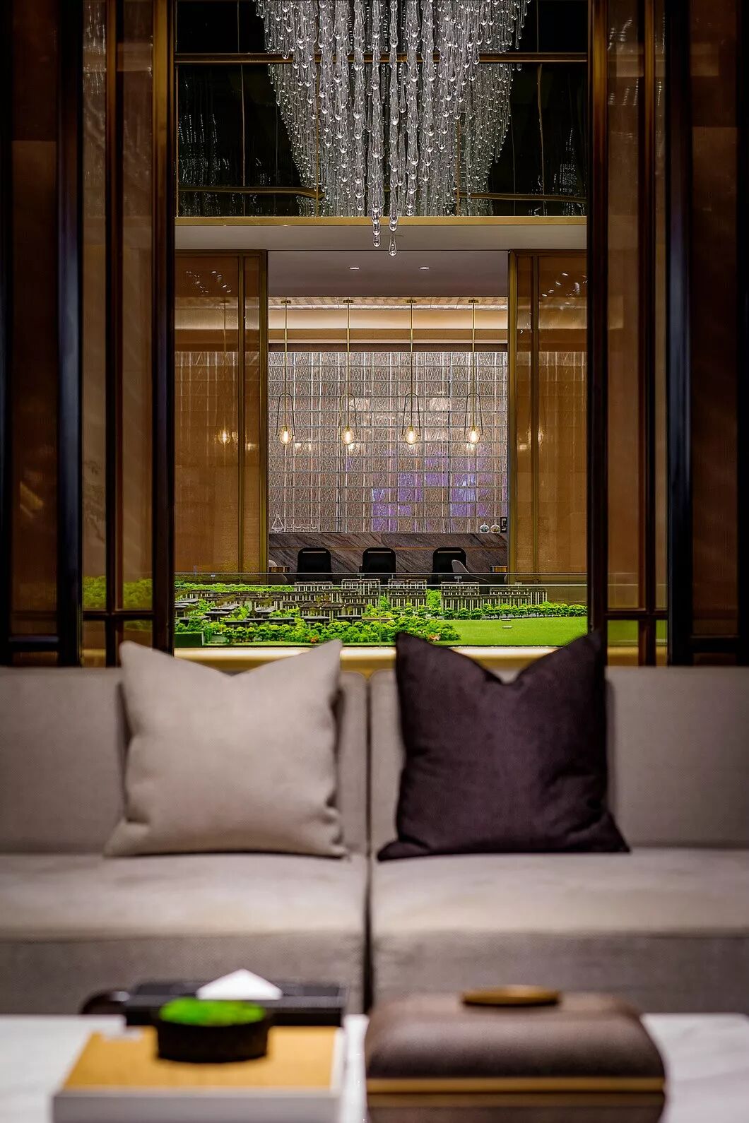 晶莹剔透的水晶装置大灯似宝石项链一般悬垂而下,以一种内敛且冷静的方式向人们呈现了一个美学力量和艺术精神兼具的空间。