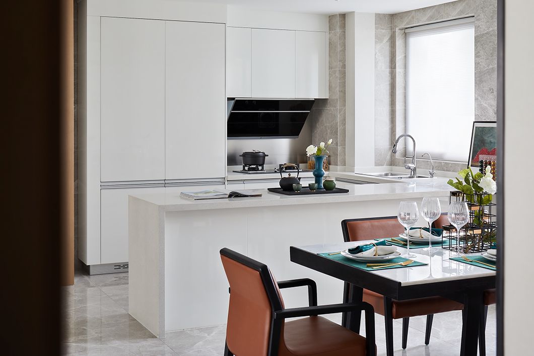 厨房吧台以茶为主题,借由装饰品成为大面积纯白场景内精妙的点缀。