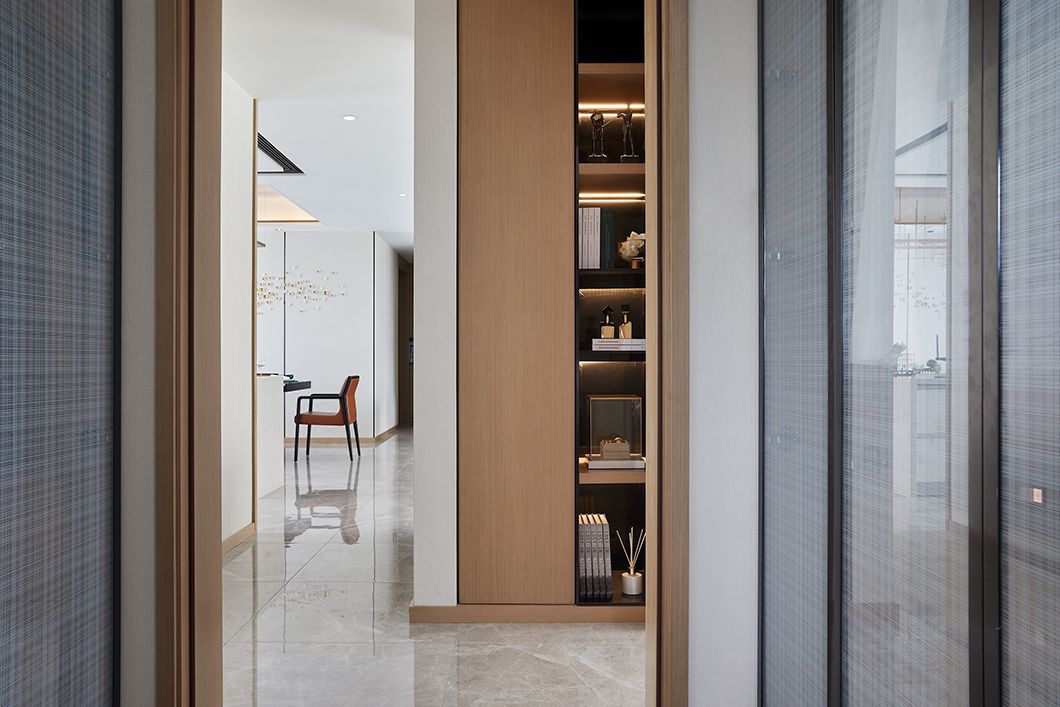 透过木格栅,主卧亦可一窥衣帽间的风采。展示性与功能性兼并的衣帽间设立于走廊尽头,设计师在不经意的笔触中,将低调奢华的高贵感勾勒而出。