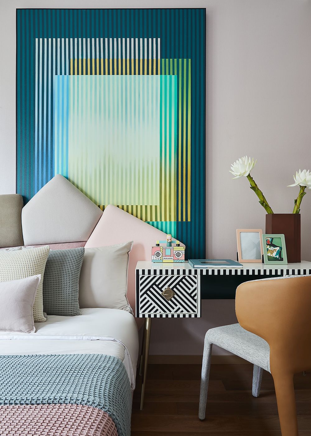 长辈房以浅灰色壁布铺陈,墙面借用非常规的侧面装饰画营造现代氛围,以柔和亮色作映衬,渲染一种亲和淳朴、安享自身的人生态度。