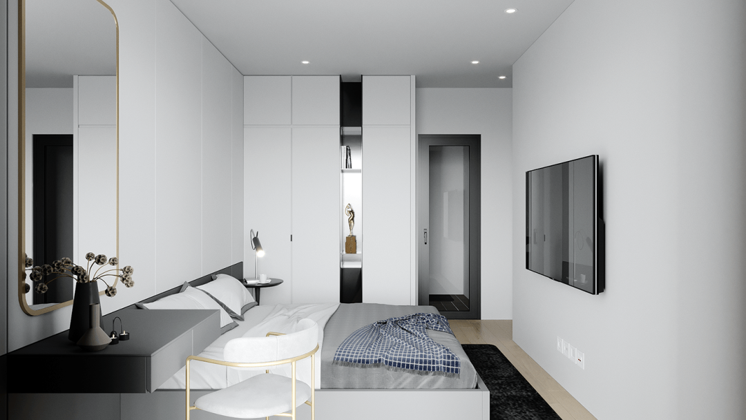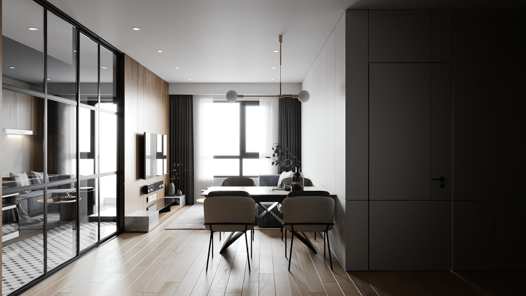 客厅的设计给人的第一印象是很简约的,大白色的空间主色调,大大的落地窗门,用了暗深灰色的窗帘,正好与室内的灰色相映衬。
