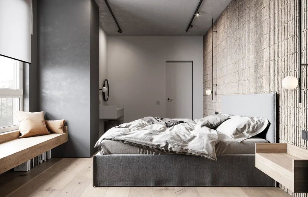 次卧主色调为较浅的灰色,与墙面同色的橱柜“隐形”了储存空间。