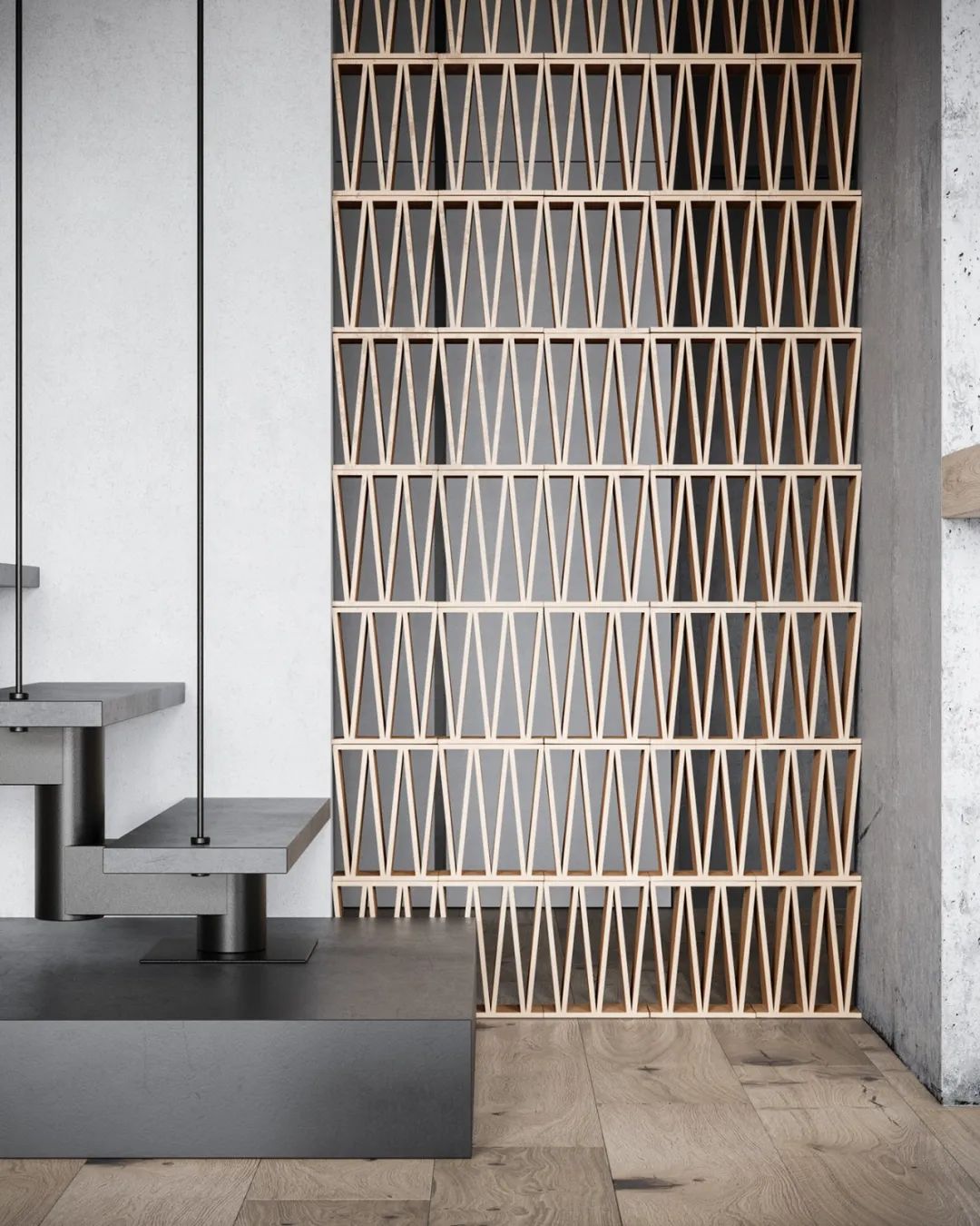 入口的另一侧,巧妙嵌入了两面隔断墙,混凝土与木格栅呈直角排布,冷与暖、虚与实的对比形成强烈视觉冲击,美感独特。