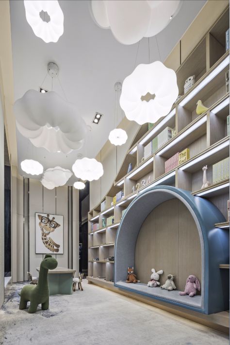 儿童区紧靠着洽谈区,以便宾客更好照看孩子。主题设置极具亲和力与艺术感,设计师以活泼的曲线造型,搭配纯净柔和的创意吊灯,为儿童营造了一个独立并且专注玩耍的意趣空间。