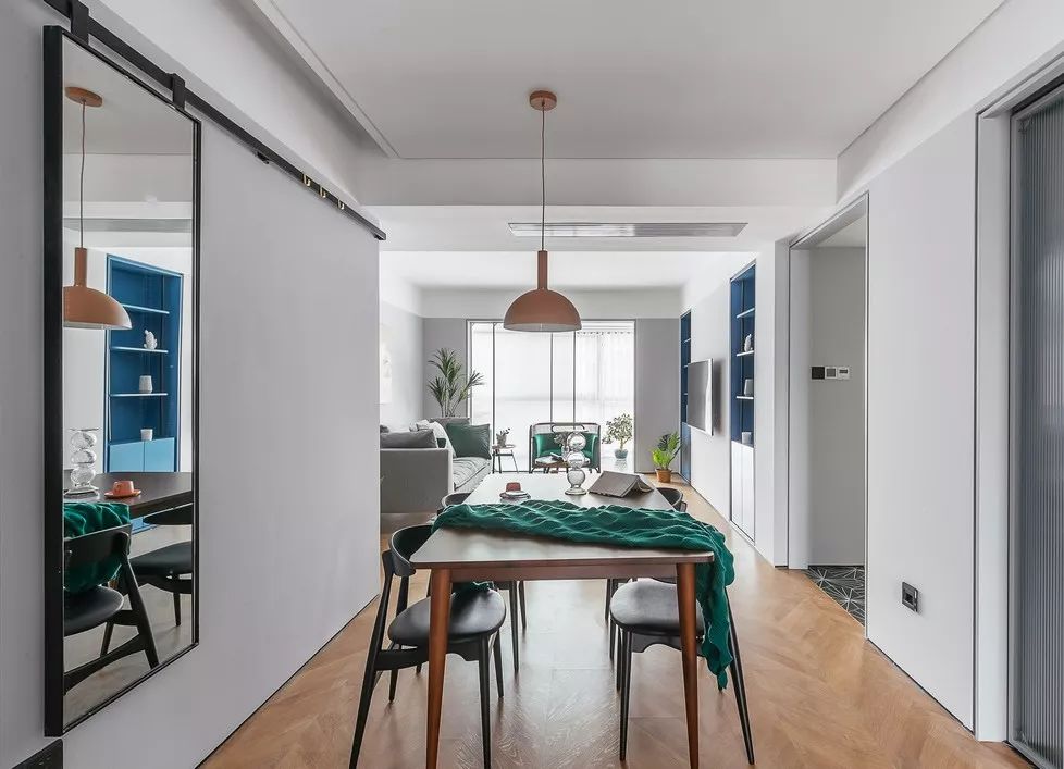 餐厅,少见的散逸着浪漫自由的气息。门厅面积不够,设计师大胆地把全身镜融入移动轨道安置在餐厅墙面上,可根据实际生活中的使用需要随意移动,强电箱刚好被完美遮挡。