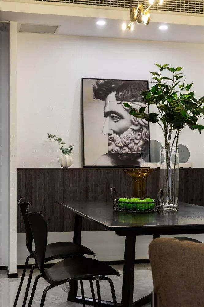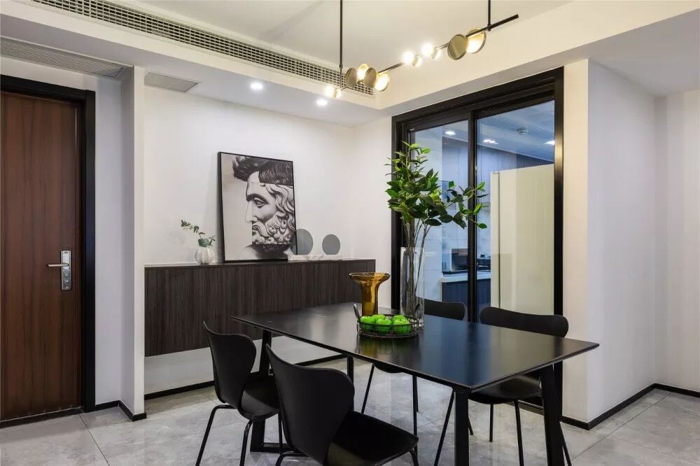 ▲ 黑白两色一路贯穿到餐厅,方桌更适合简约现代的布局,高级而理性。