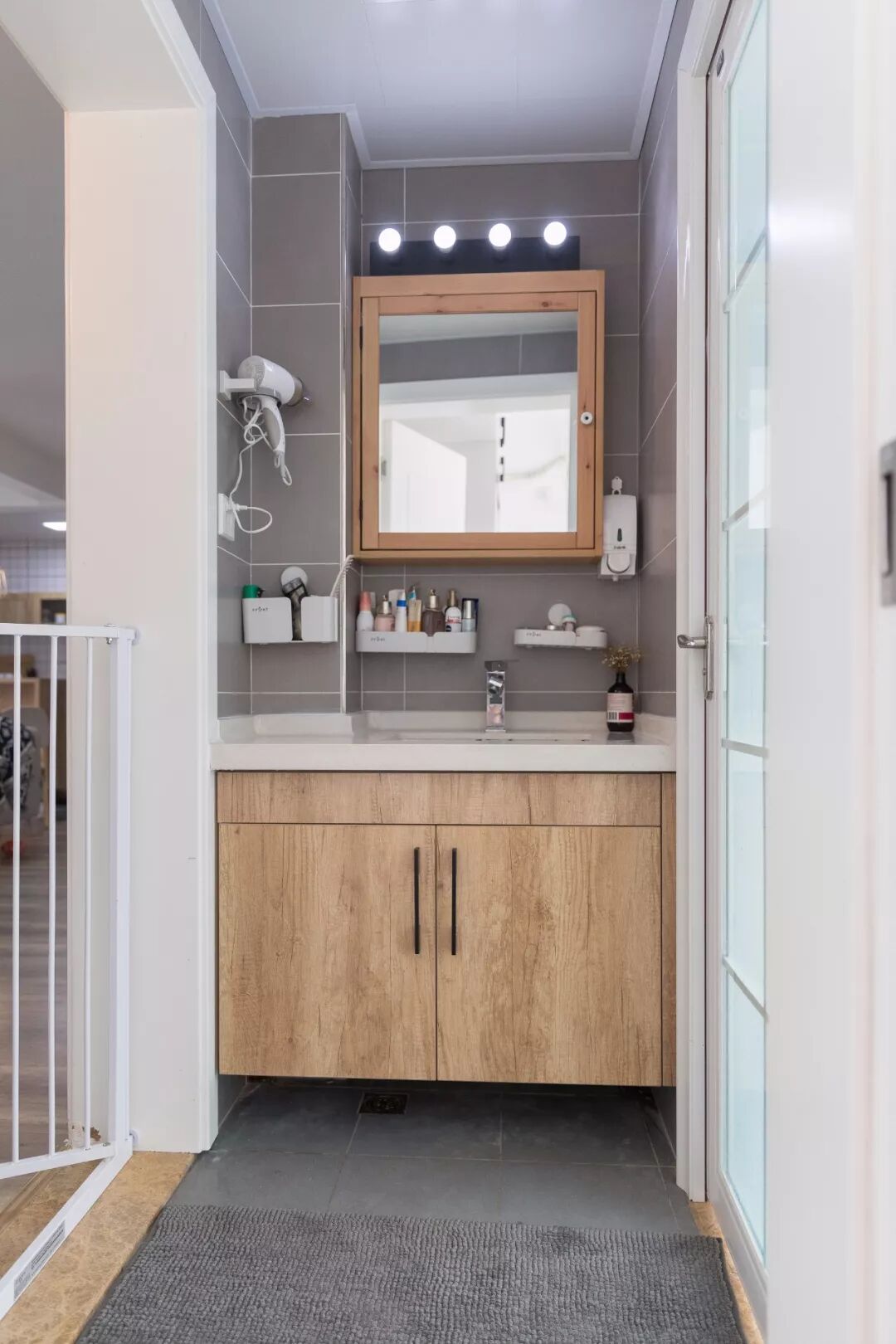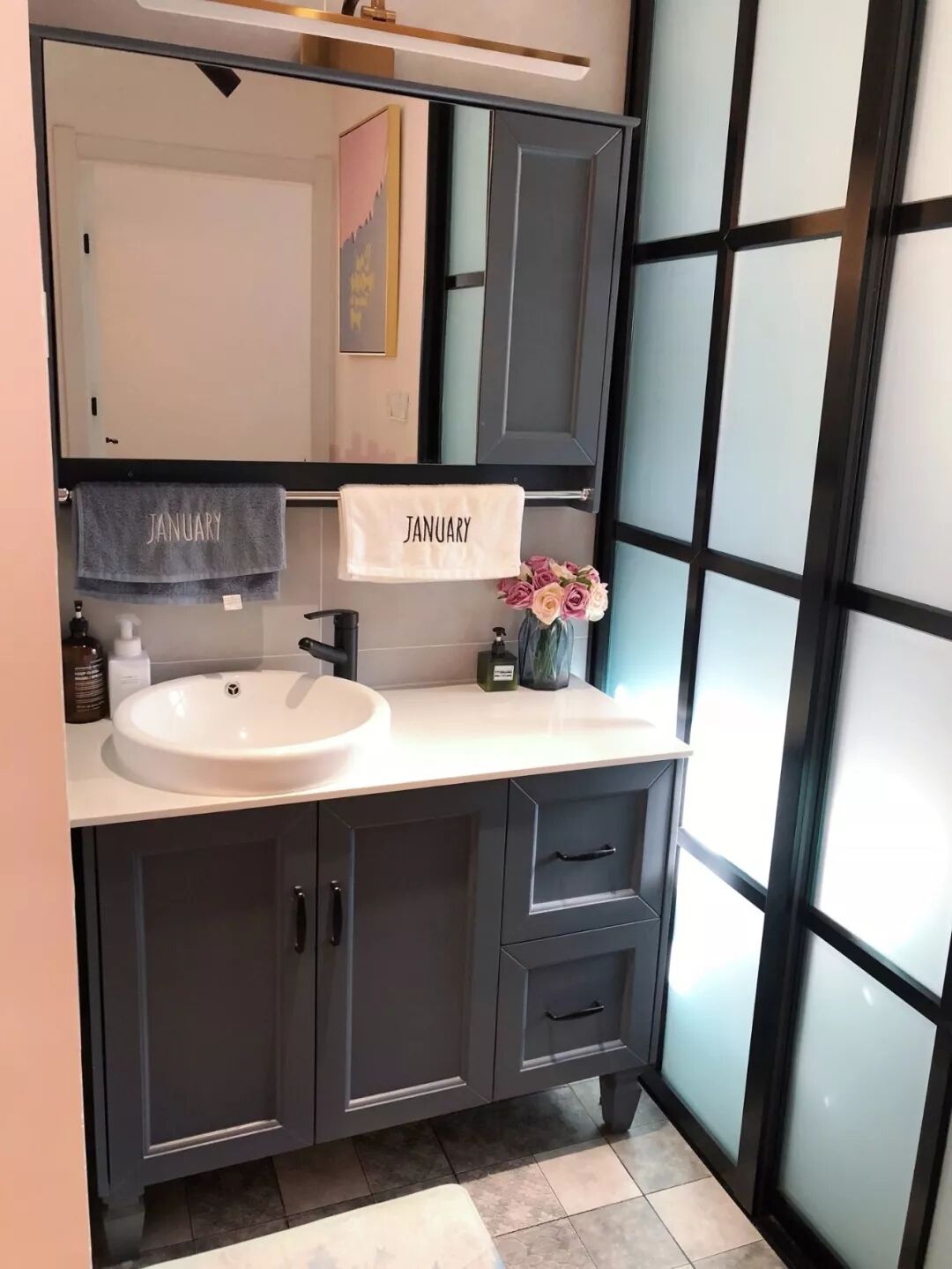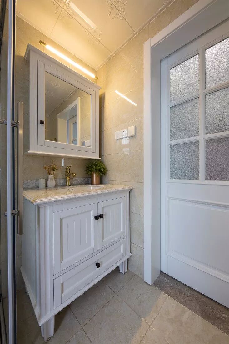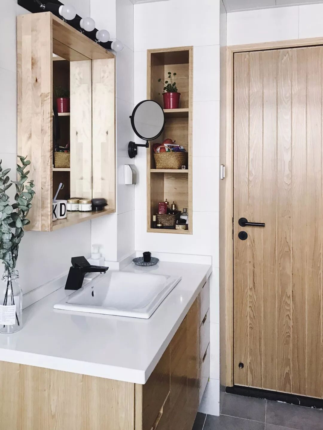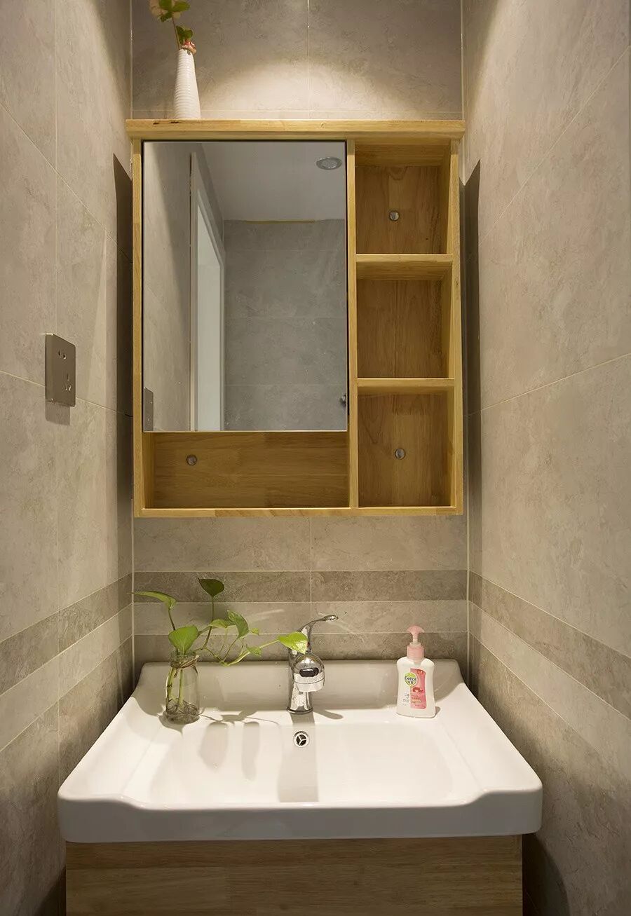 卫生间的镜子一般是用来梳妆的,而洗手台里侧的空间一般都是闲置的,这个时候就可以把镜子后面装成柜体,而柜子底部就留空成格架,洗漱用品就放在这里方便使用。