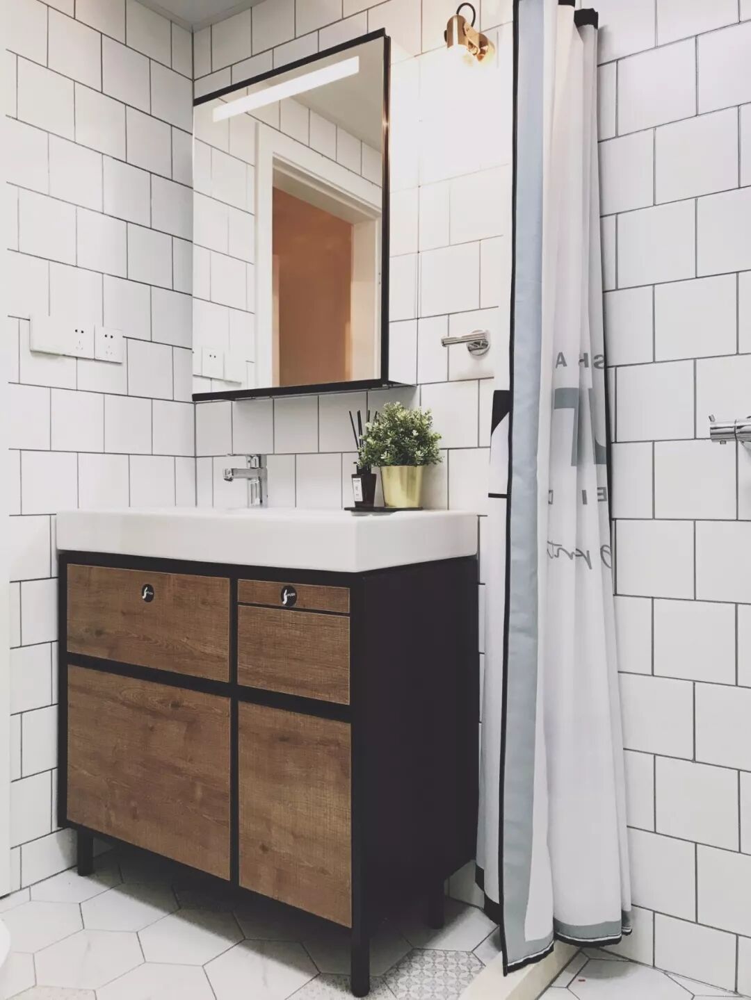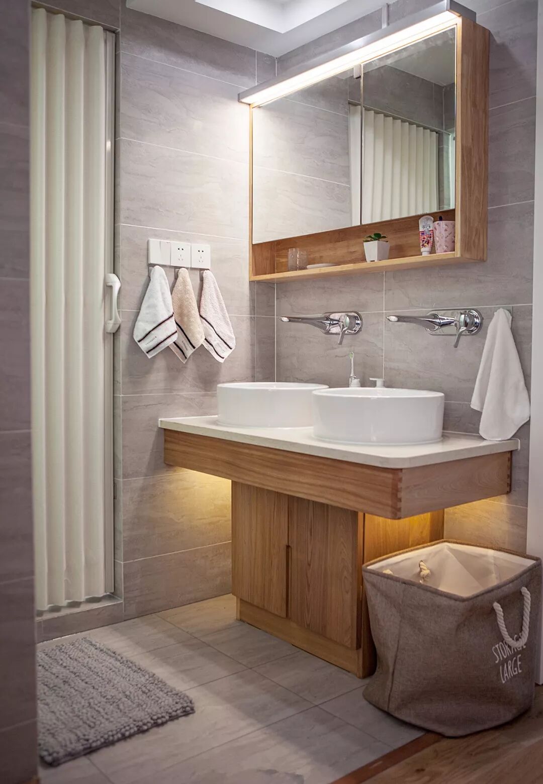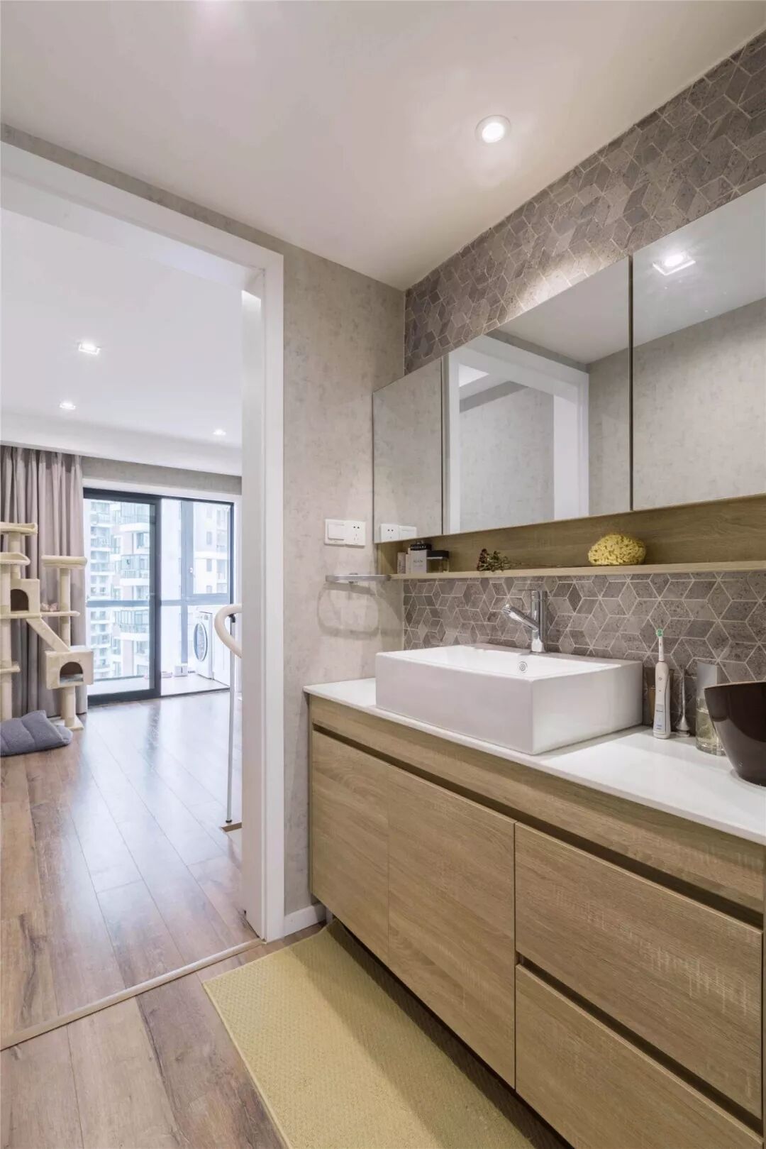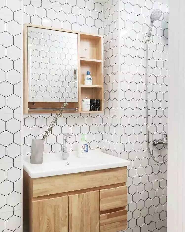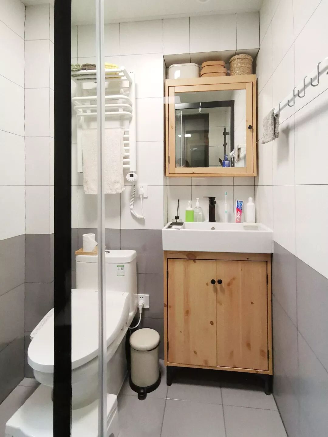 卫生间的镜子一般是用来梳妆的,而洗手台里侧的空间一般都是闲置的,这个时候就可以把镜子后面装成柜体,而柜子底部就留空成格架,洗漱用品就放在这里方便使用。