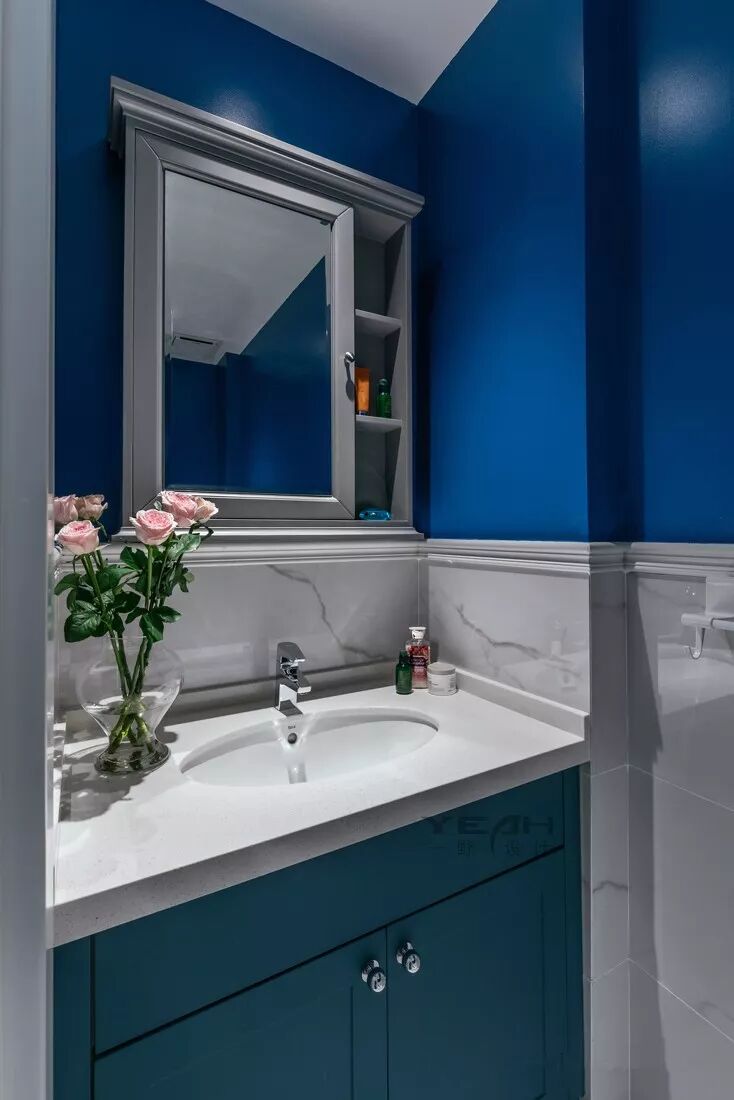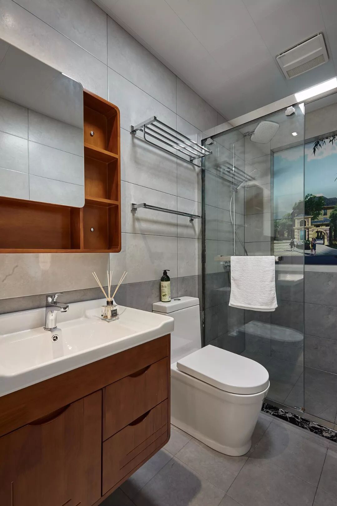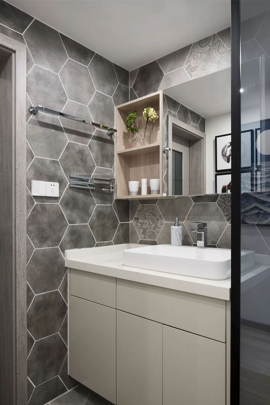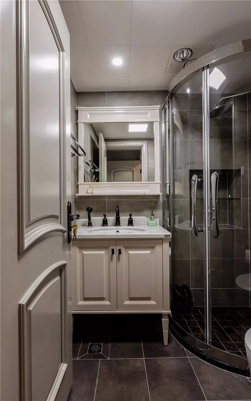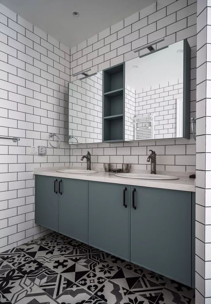 卫生间的镜子一般是用来梳妆的,而洗手台里侧的空间一般都是闲置的,这个时候就可以把镜子后面装成柜体,而柜子底部就留空成格架,洗漱用品就放在这里方便使用。