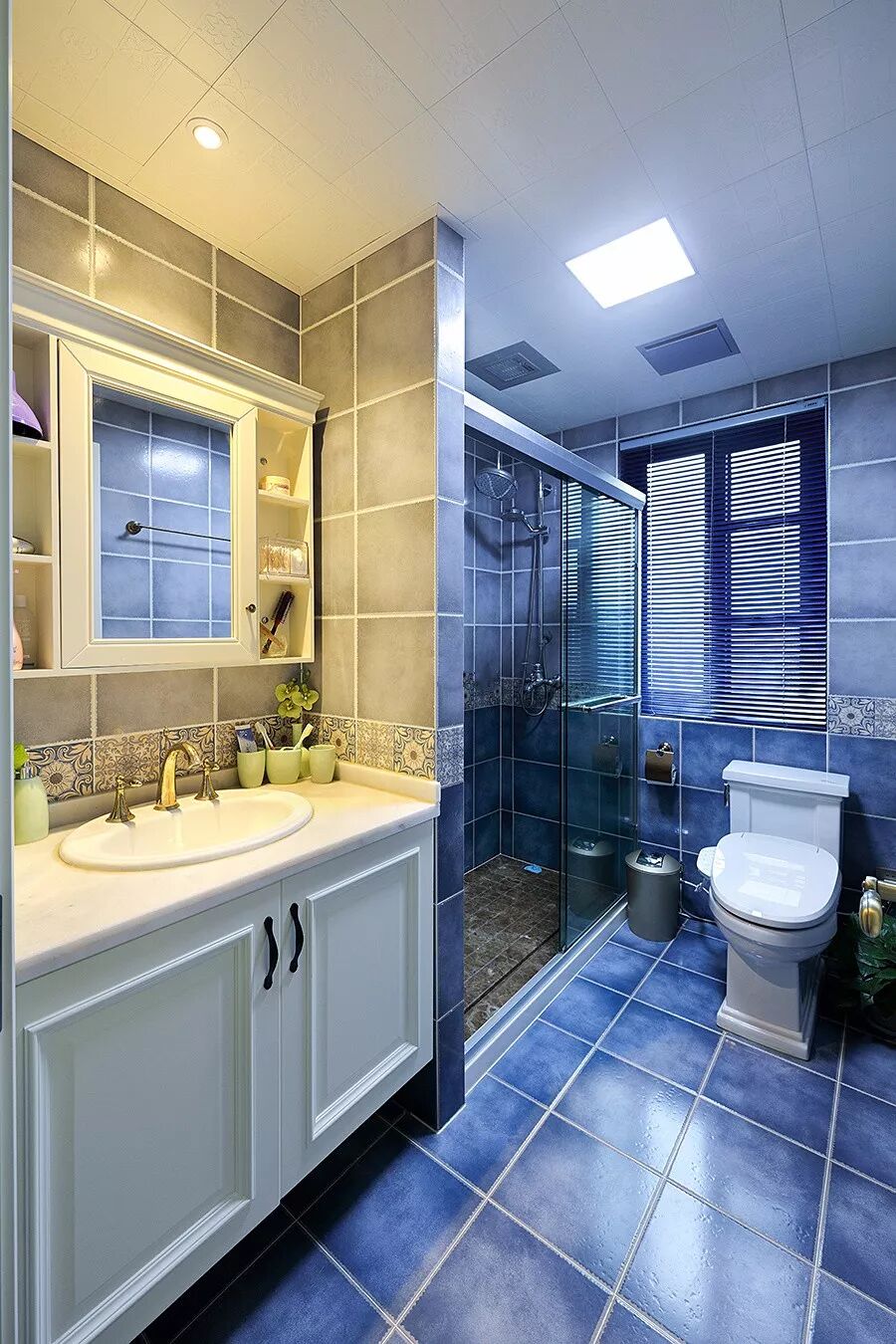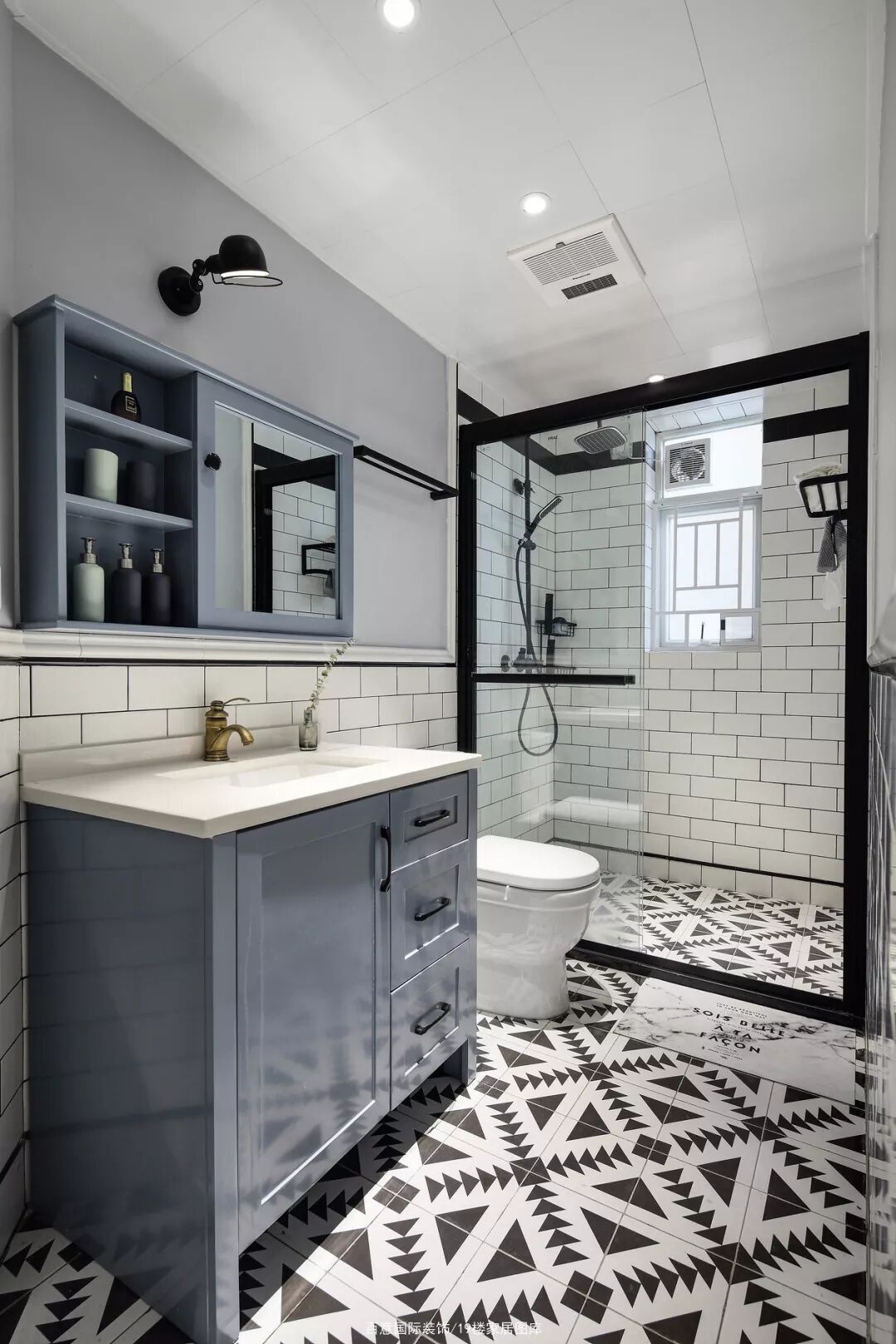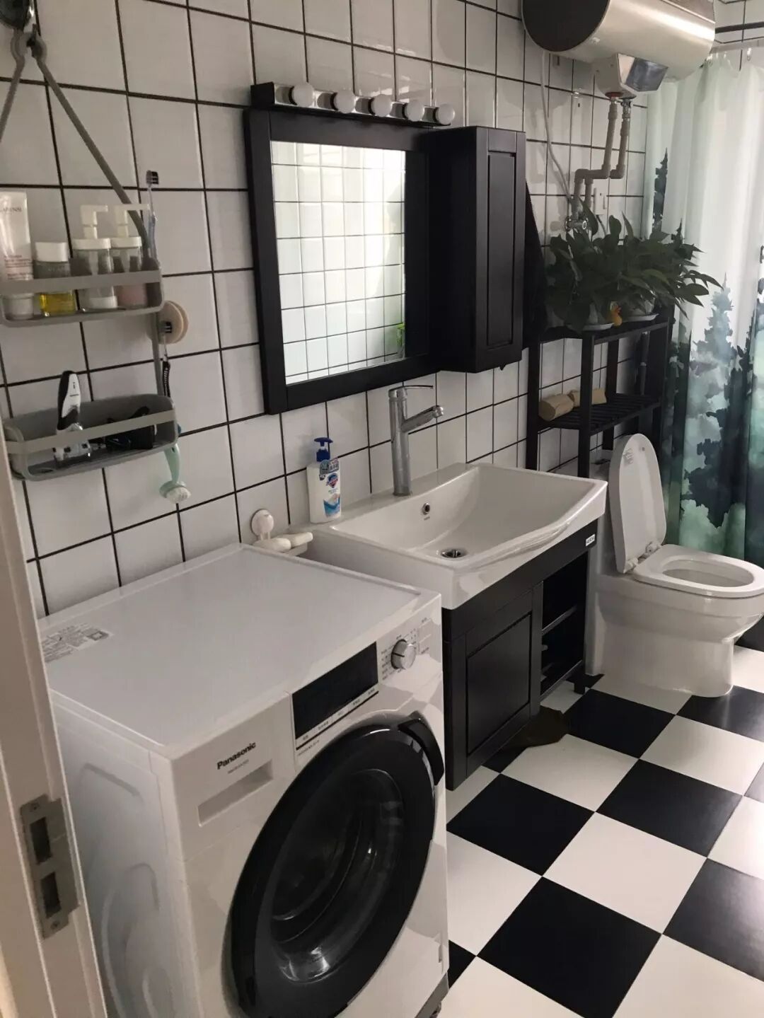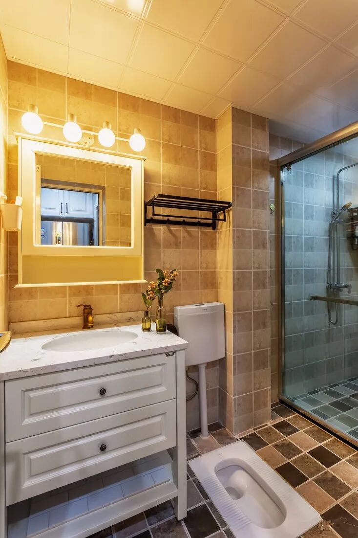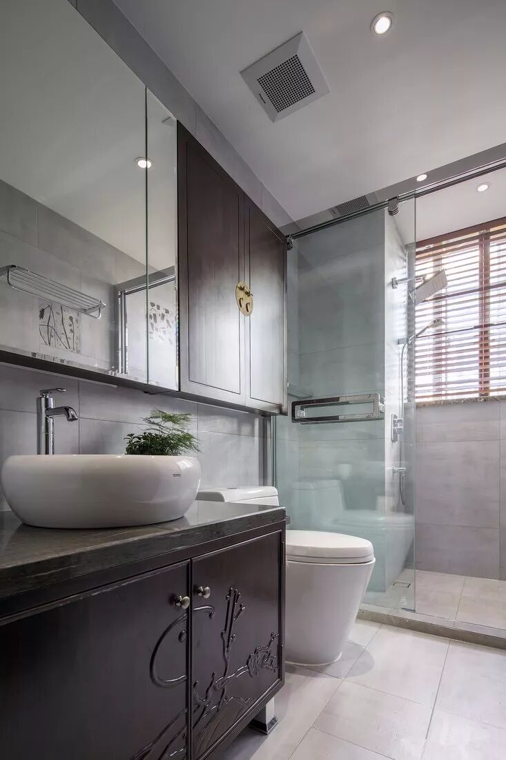 卫生间的镜子一般是用来梳妆的,而洗手台里侧的空间一般都是闲置的,这个时候就可以把镜子后面装成柜体,而柜子底部就留空成格架,洗漱用品就放在这里方便使用。