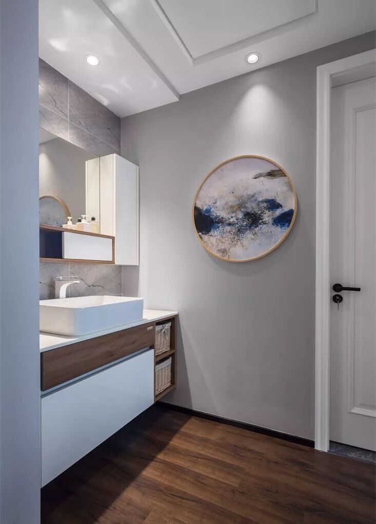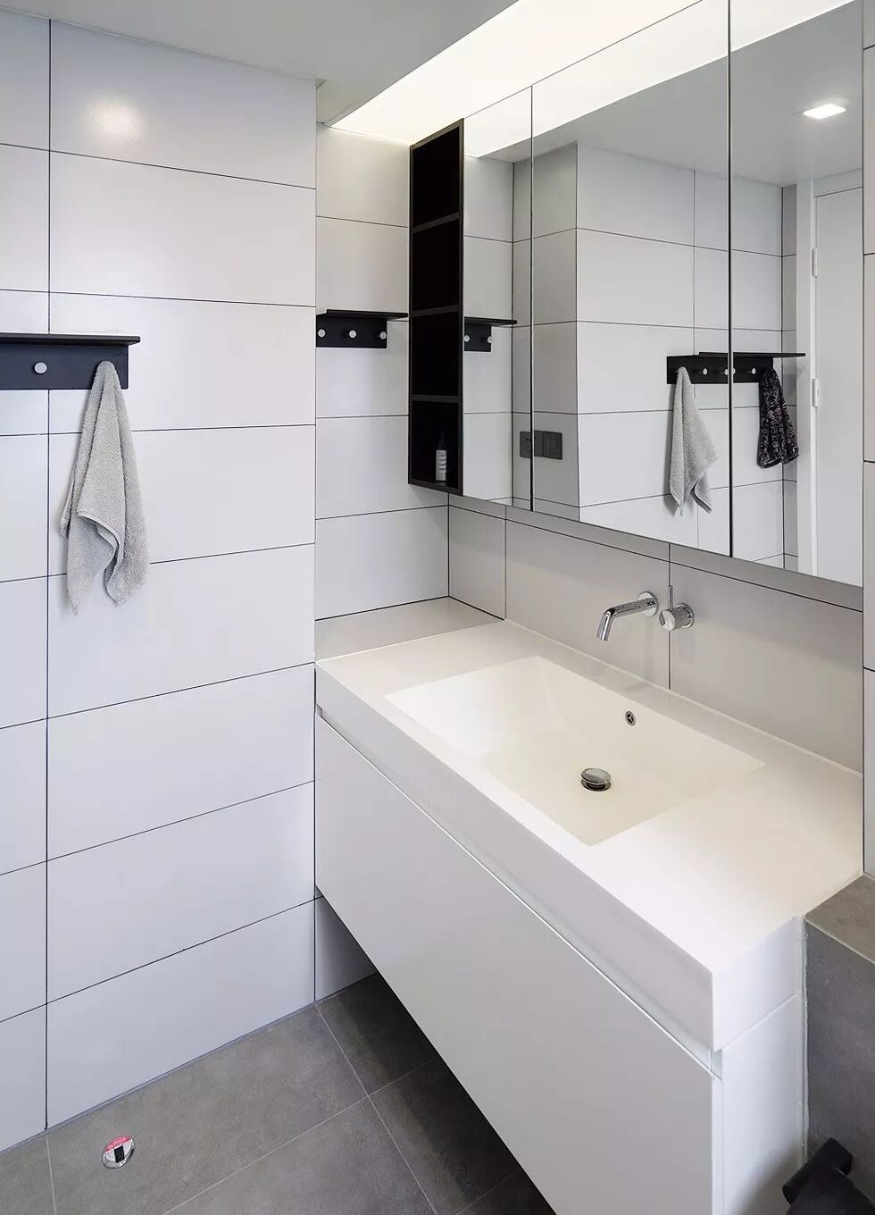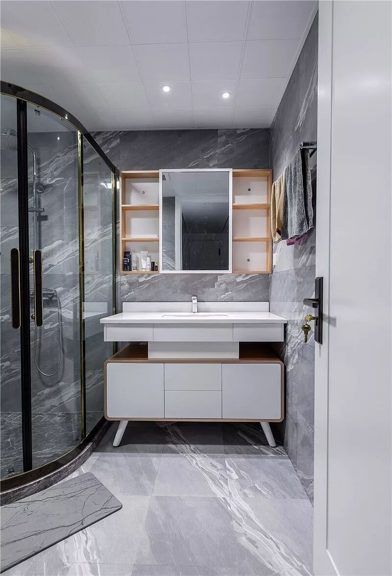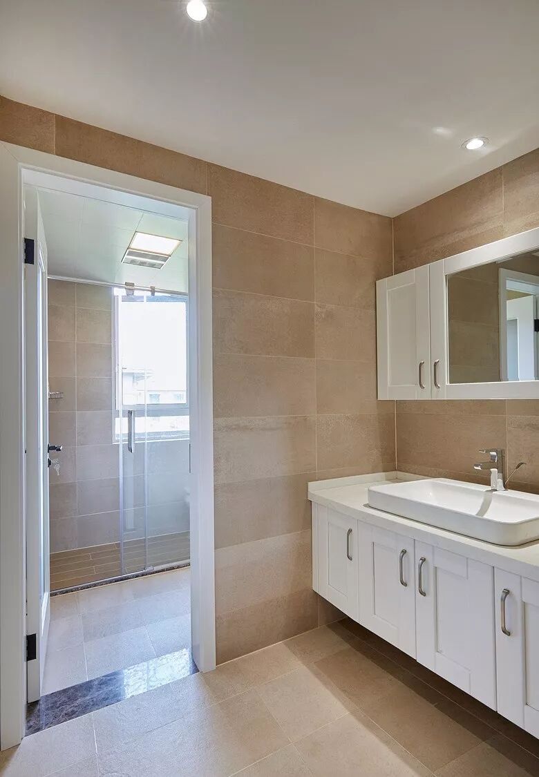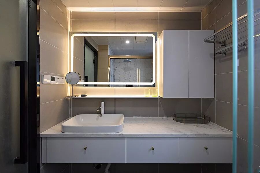 洗手盆的长度较大的情况下,就可以在镜柜的基础,侧边留空出格架,洗漱用品也可以放进去,比较高的位置可以放下不常用的。